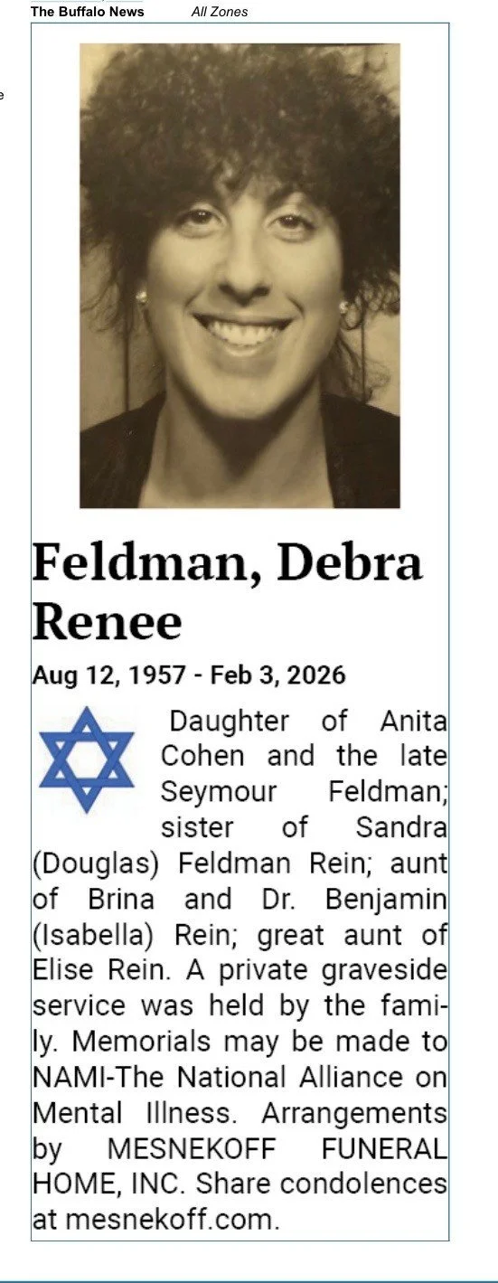 Debra Renee Feldman-A Private Graveside Service will be held by family. Donations to NAMI. Wednesday, February 4, 2026 4:30 PM 5:30 PM 16:30 17:30 Mesnekoff Funeral Home, Inc. 8630 Transit Rd East Amherst, NY, 14051 United States (map) Google Calendar ICS